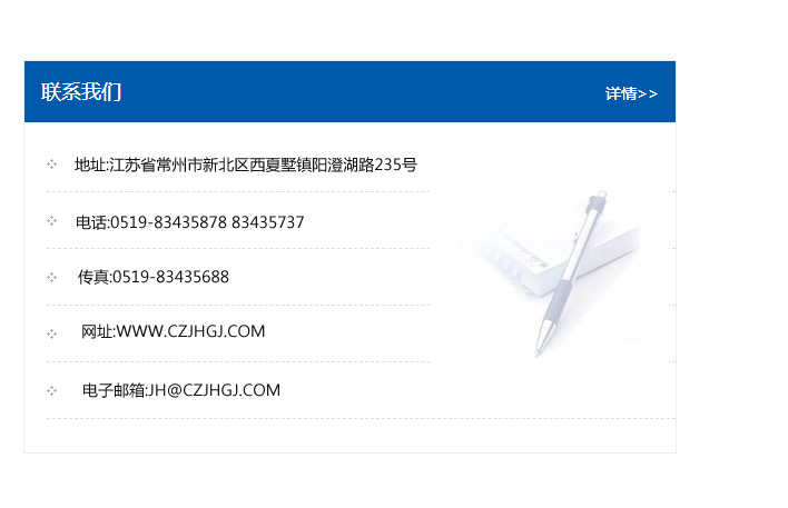 傳真:0519-83435688    郵編:213135    網址:WWW.czjhgj_com.yzbyspx.com    電子郵箱:JH@czjhgj_com.yzbyspx.com